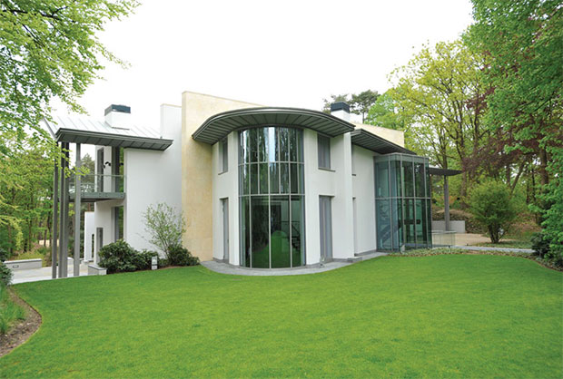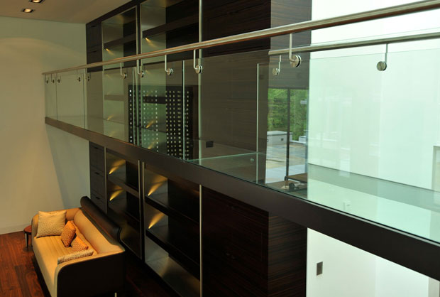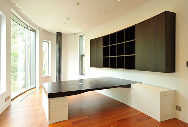 Voor dit woonhuis van formaat realiseerden we vrijwel al het interieurwerk, binnendeuren, wanden, keuken, los meubilair, maar ook de zitmeubelen. Blikvanger is de in coromandel uitgevoerde boekenkast over twee etages.