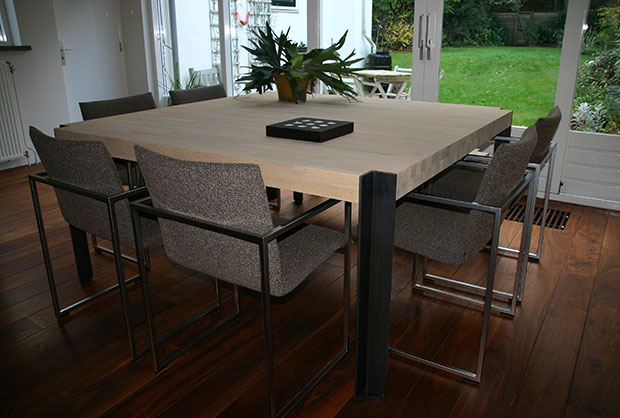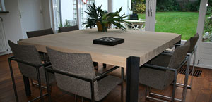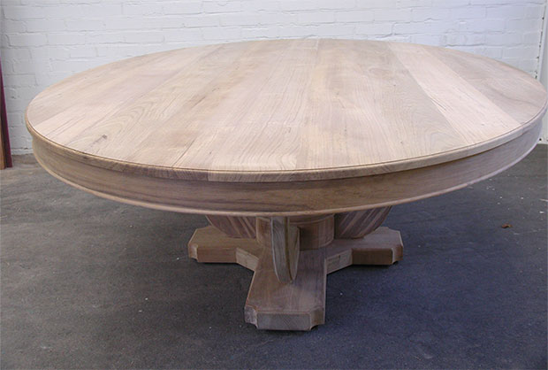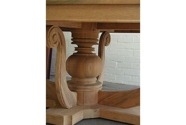 Naar klassiek ontwerp vervaardigden we een aantal tafels in zowel ronde als ovale uitvoering. Teakhout is de basis. Hier kunt u goed onze expertise op het gebied van lamineren, draai- en beeldhouwwerk toegepast zien