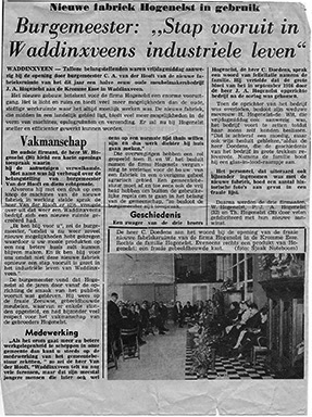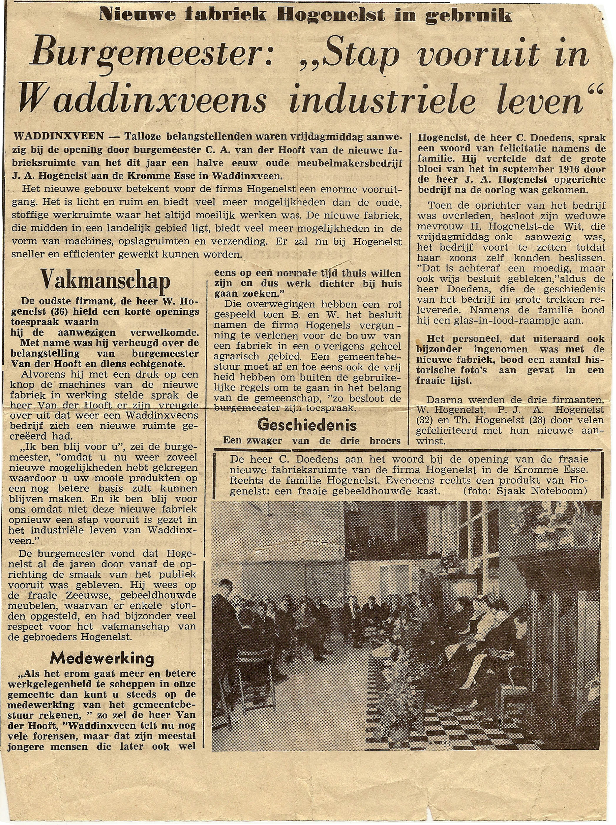 Na z’n overlijden namen zijn drie zonen het bedrijf over. Wim, Piet en Theo (mijn vader) waren bevlogen meubelmakers en gek van stijl en vormgeving. Zij bouwden het bedrijf verder uit. De schuur werd te klein en uiteindelijk verhuisden ze naar de Kromme Esse waar ze een heuse fabriek bouwden. De burgemeester van Waddinxveen opende in de zomer van 1966 de ‘fabriek’. Vanaf deze periode werkten ze onder de naam Meubelfabriek J.A. Hogenelst B.V. in het topsegment als meubelproducent voor de detailhandel. Hogenelst werd een begrip.
